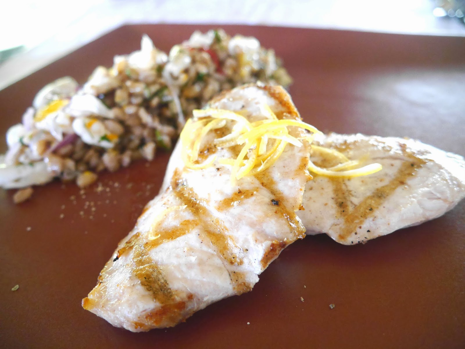 This was our first time having Hamachi. The texture was different from a fish and tasted like lean pork instead. The grilled hamachi was over done and tasted pretty dry. The herb and calamari salad with barley were refreshing though.